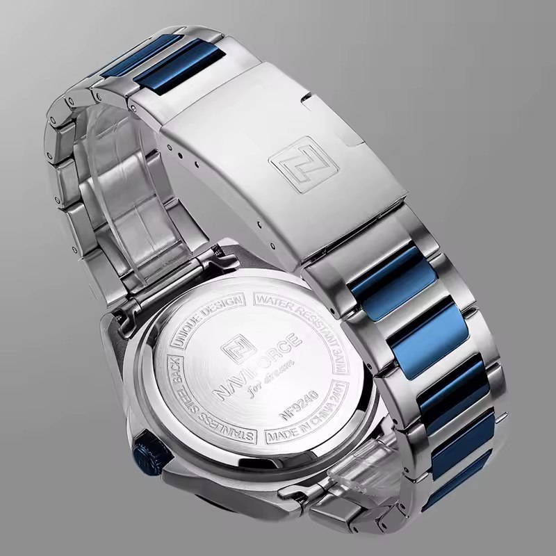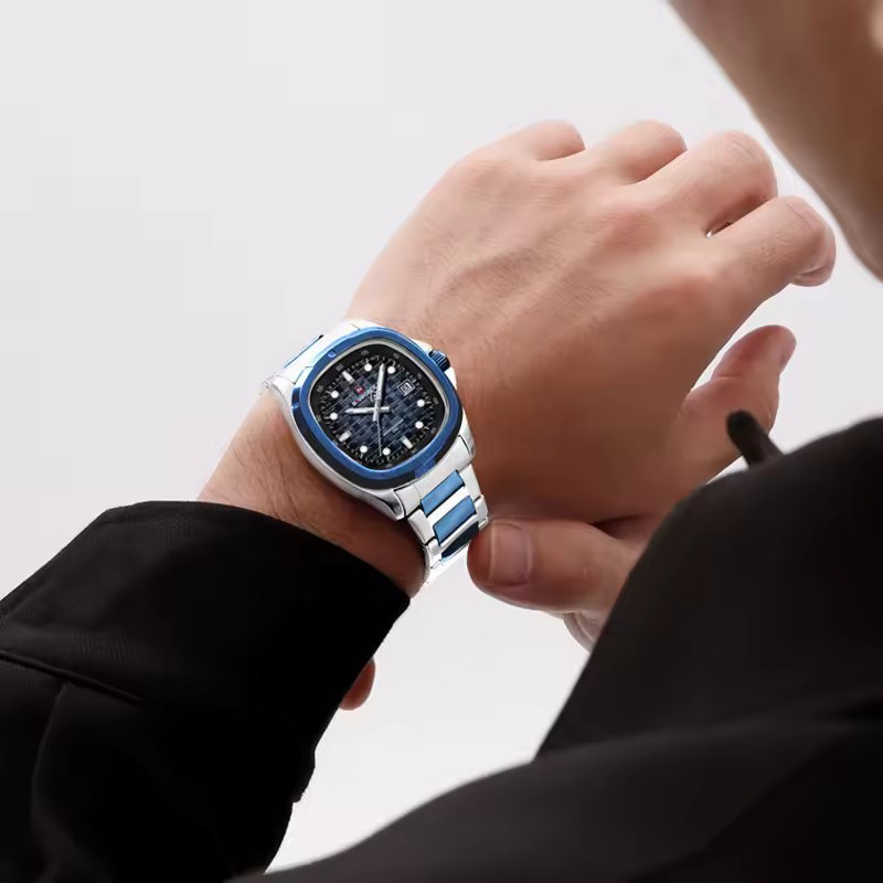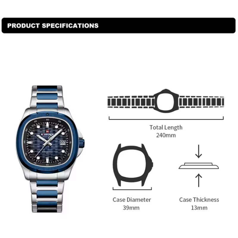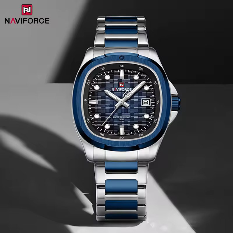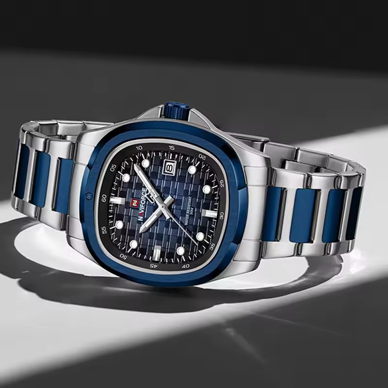 این ساعت مچی عقربهای مردانه نیوی فورس NAVIFORCE مدل Nf9240 اصلی با طراحی خاص و صفحه مربع طرح پتک در فروشگاه اینترنتی روبی مد عرضه میشود و با موتور ژاپنی دقیق و قابلیت تقویم عملکردی قابل اعتماد ارائه میدهد و قاب استیل مقاوم همراه با بند استیل توپُر رنگ ثابت دوام بالایی ایجاد میکند و شیشه معدنی ضد خش از صفحه محافظت میکند و بند ضد حساسیت پوستی راحتی استفاده روزانه را بالا میبرد و عقربه شبنما خوانایی ساعت را در نور کم حفظ میکند و قفل کلیپسی ضامندار امنیت استفاده را تضمین میکند و این مدل ضد آب بوده و همراه با جعبه و کارت گارانتی اورجینال ارائه میشود تا یک انتخاب شیک و ماندگار برای استایل روزمره و رسمی باشد.