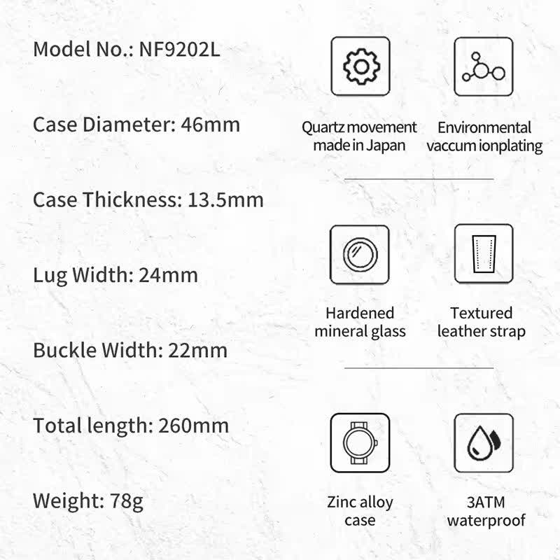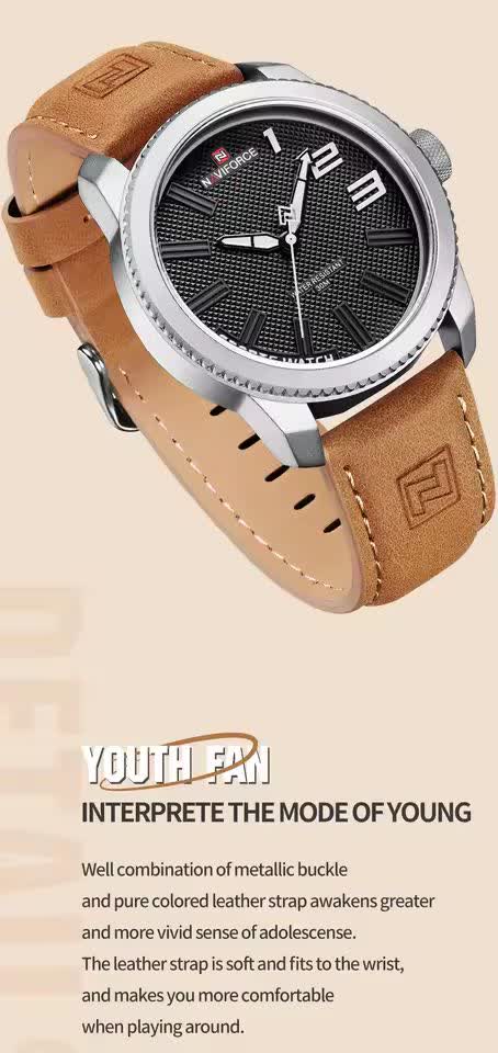 ساعت مچی مردانه نیوی فورس NAVIFORCE مدل NF92021 بند چرمی با طراحی شیک و کلاسیک گزینهای مناسب برای آقایان خوش سلیقه است. این ساعت دارای بند چرمی قهوهای دور دوخت و ضد حساسیت پوستی با صفحه گرد مشکی میباشد که ظاهری جذاب و مردانه ایجاد میکند. قاب استیل مقاوم شیشه معدنی ضد خش و عقربههای شب نما کیفیت و دوام بالای ساعت را تضمین میکند. موتور ژاپن کوارتز دقیق به همراه خاصیت ضد آب بودن عملکردی مطمئن برای استفاده روزمره فراهم کرده است. این محصول به صورت کاملا ارجینال با جعبه و کارت گارانتی و همراه با گارانتی نیوی فورس ایران از فروشگاه اینترنتی روبی مد عرضه میشود.
