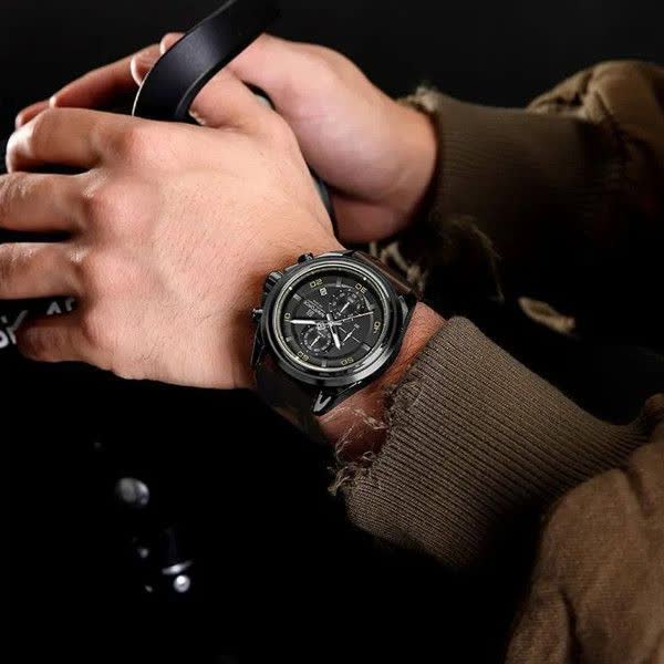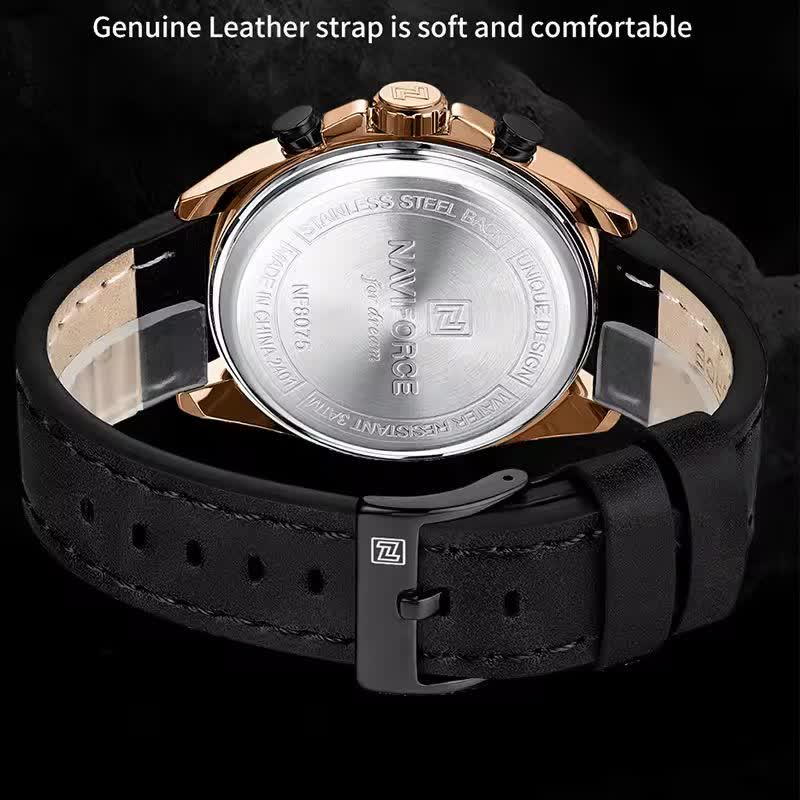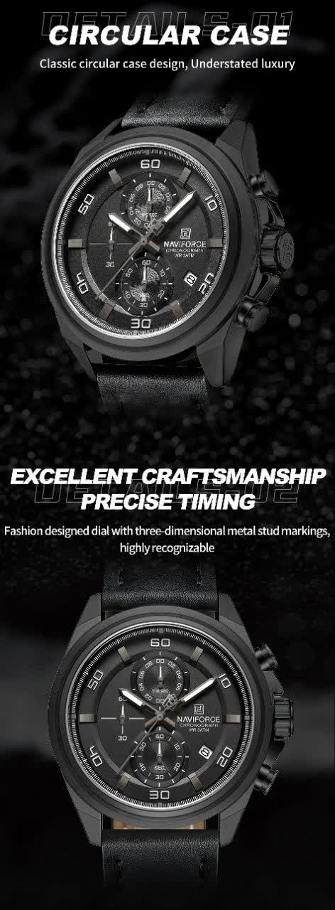 ساعت مچی کرنوگراف مردانه نیوی فورس NAVIFORCE مدل NF8075 با موتور ژاپن انتخابی قدرتمند و حرفهای برای آقایان خوش استایل است. این مدل با بند چرم مشکی اصلی و باکیفیت دور دوخت و ضد حساسیت پوستی به همراه صفحه دایره ای مشکی جلوهای شیک و اسپرت دارد. سه موتور فعال کرنوگراف تقویم دقیق و موتور ژاپن کوارتز عملکردی دقیق و کاربردی را ارائه میدهد. قاب استیل مقاوم شیشه معدنی ضد خش عقربههای شب تاب و خاصیت ضد آب بودن دوام بالای ساعت را تضمین میکند. این محصول به صورت کاملا ارجینال با جعبه و کارت گارانتی و همراه با گارانتی نیوی فورس ایران از فروشگاه اینترنتی روبی مد عرضه میشود.