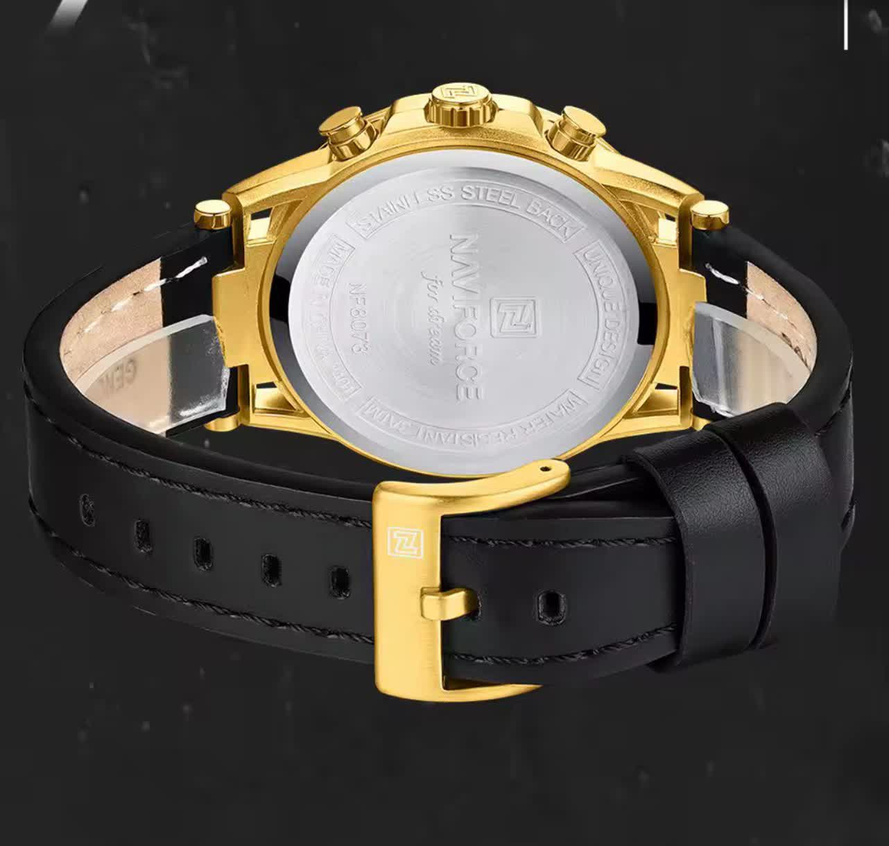 ساعت مچی کرنوگراف مردانه نیوی فورس NAVIFORCE مدل NF8073 با موتور ژاپن انتخابی لوکس و قدرتمند برای آقایان خوش استایل است. این مدل با بند چرم مشکی اصلی و باکیفیت دور دوخت و ضد حساسیت پوستی به همراه صفحه و قاب طلایی جلوهای رسمی و چشمگیر دارد. سه موتور فعال کرنوگراف به همراه تقویم و موتور ژاپن کوارتز دقت و کارایی بالایی را فراهم میکند. قاب استیل مقاوم شیشه معدنی ضد خش عقربههای شب تاب و خاصیت ضد آب بودن دوام و کیفیت ساعت را تضمین میکند. این محصول به صورت کاملا ارجینال با جعبه و کارت گارانتی و همراه با گارانتی نیوی فورس ایران از فروشگاه اینترنتی روبی مد عرضه میشود.