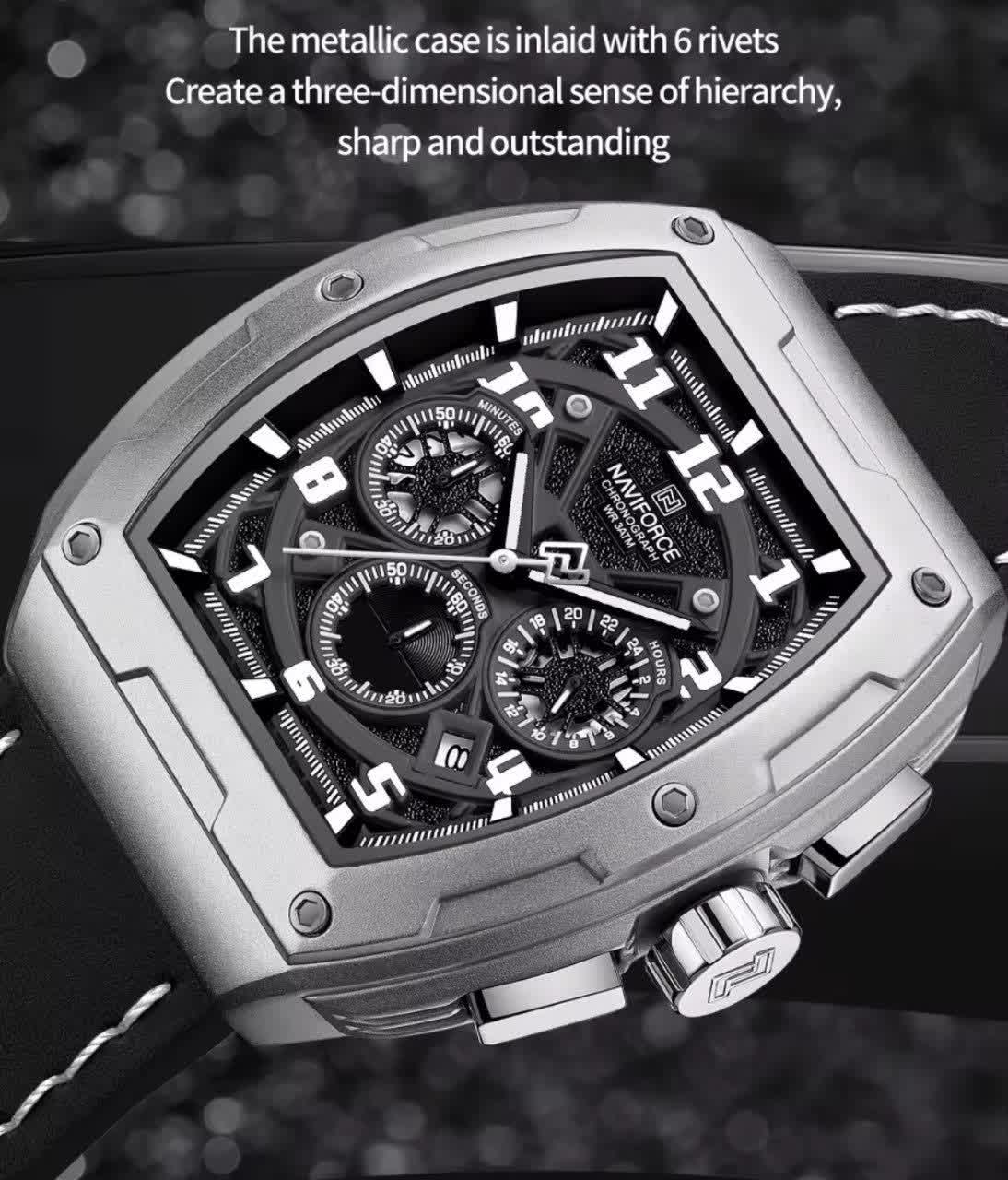 ساعت مچی کرنوگراف مردانه نیوی فورس NAVIFORCE مدل NF8053 با موتور ژاپن انتخابی شیک و خاص برای آقایان خوشسلیقه است. این ساعت با بند چرم مشکی اصلی و باکیفیت دور دوخت و ضد حساسیت پوستی به همراه صفحه مستطیل مشکی و قاب نقرهای جلوهای کلاسیک و مدرن دارد. سه موتور فعال کرنوگراف به همراه تقویم و موتور ژاپن کوارتز دقت و عملکرد قابل اعتماد را ارائه میدهد. قاب استیل مقاوم شیشه معدنی ضد خش عقربههای شب تاب و خاصیت ضد آب بودن دوام و کیفیت بالای ساعت را تضمین میکند. این محصول به صورت کاملا ارجینال با جعبه و کارت گارانتی و همراه با گارانتی نیوی فورس ایران از فروشگاه اینترنتی روبی مد عرضه میشود.
