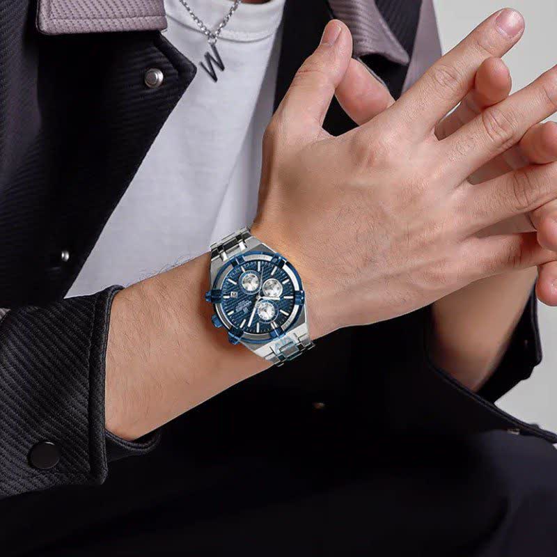 ساعت مچی کرنوگراف مردانه نیوی فورس NAVIFORCE مدل Nf8042 اورجینال استیل با موتور ژاپن انتخابی حرفه ای و جذاب برای استایل روزمره و رسمی است. این ساعت با بند استیل رنگ ثابت توپُر و صفحه آبی طراحی شده و جلوه ای مدرن و مردانه دارد. سه موتوره کرنوگراف تقویم دار قاب استیل عقربه های شب تاب شیشه معدنی ضد خش و مقاومت در برابر آب از ویژگی های کاربردی آن به شمار می رود. بند ضد حساسیت پوستی در کنار قفل کلیپسی ضامن دار راحتی و امنیت بالایی ایجاد می کند. این محصول اصل به همراه جعبه و کارت گارانتی معتبر نیوی فورس ایران از فروشگاه اینترنتی روبی مد عرضه می شود.