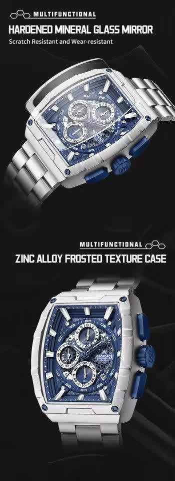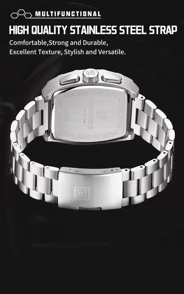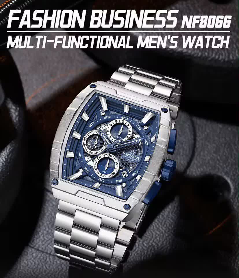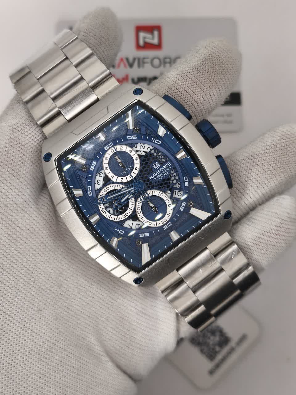 ساعت مچی کرنوگراف مردانه نیوی فورس NAVIFORCE مدل Nf8066 با صفحه آبي و موتور ژاپن کوارتز انتخابی خاص و متفاوت برای آقایان خوش سلیقه است. این مدل با بند استیل ضد زنگ توپُر و سنگین و صفحه مستطیلی طراحی شده و جلوه ای مدرن و لوکس دارد. سه موتوره کرنوگراف تقویم دار قاب استیل عقربه های شب تاب شیشه معدنی ضد خش و مقاومت در برابر آب از ویژگی های کاربردی این ساعت هستند. بند ضد حساسیت پوستی در کنار قفل کلیپسی ضامن دار راحتی و ایمنی بالایی فراهم می کند. این محصول اصل به همراه جعبه و کارت گارانتی معتبر نیوی فورس ایران از فروشگاه اینترنتی روبی مد عرضه می شود.