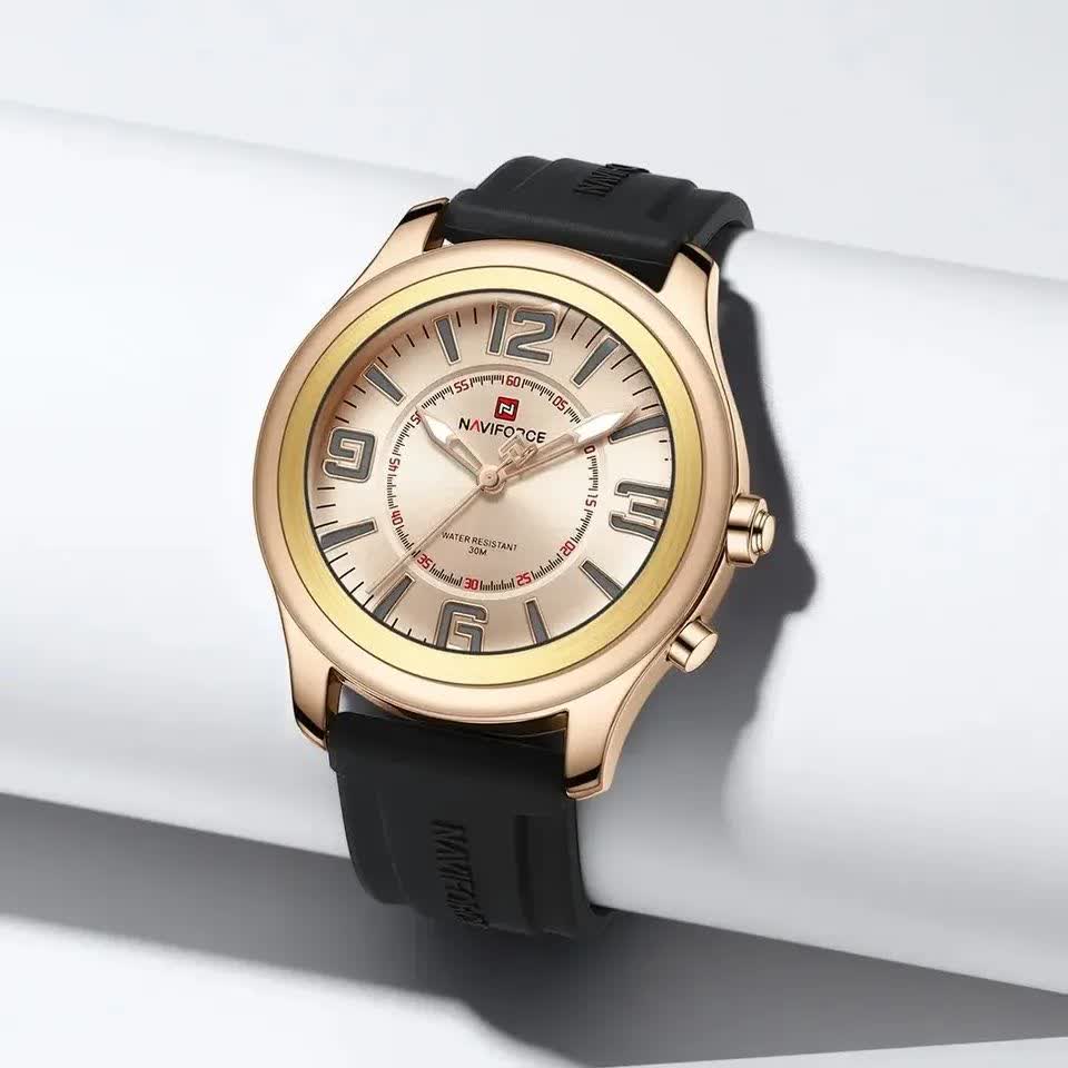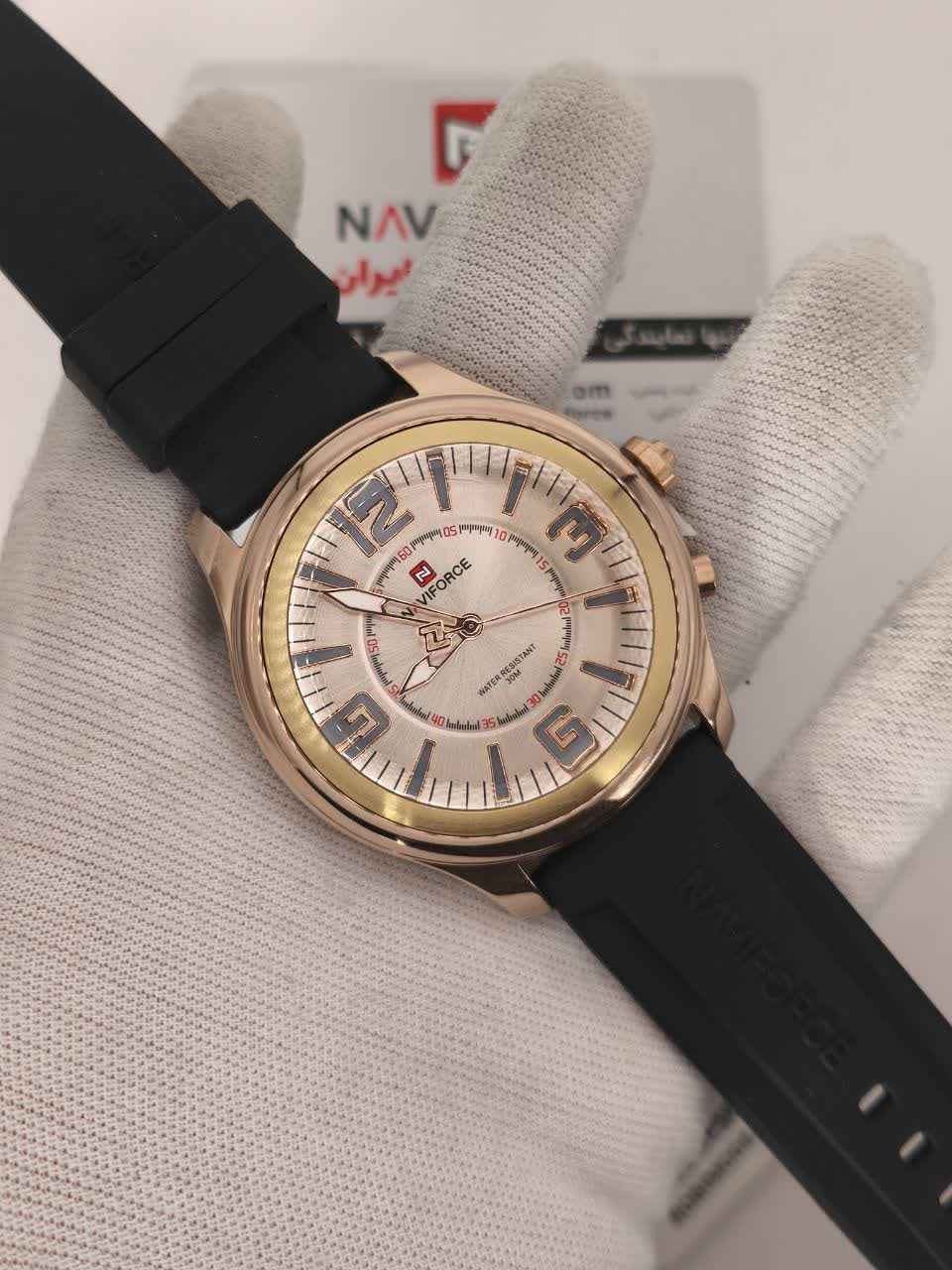 ساعت مچی عقربه ای مردانه نیوی فورس NAVIFORCE مدل Nf9256 با موتور ژاپن کوارتز انتخابی شیک و کاربردی برای استایل روزمره و اسپرت است. این ساعت با بند رابر مشکی ضد حساسیت و ضد تعریق و قاب استیل طلایی رنگ ثابت طراحی شده و جلوه ای جذاب دارد. وجود تقویم عقربه های شب نما شیشه معدنی و مقاومت در برابر آب کارایی بالای آن را تضمین می کند. فرم صفحه گرد و قفل سگکی استفاده ای راحت و مطمئن فراهم می سازد. این محصول اصل به همراه جعبه و کارت گارانتی معتبر نیوی فورس ایران از فروشگاه اینترنتی روبی مد عرضه می شود.