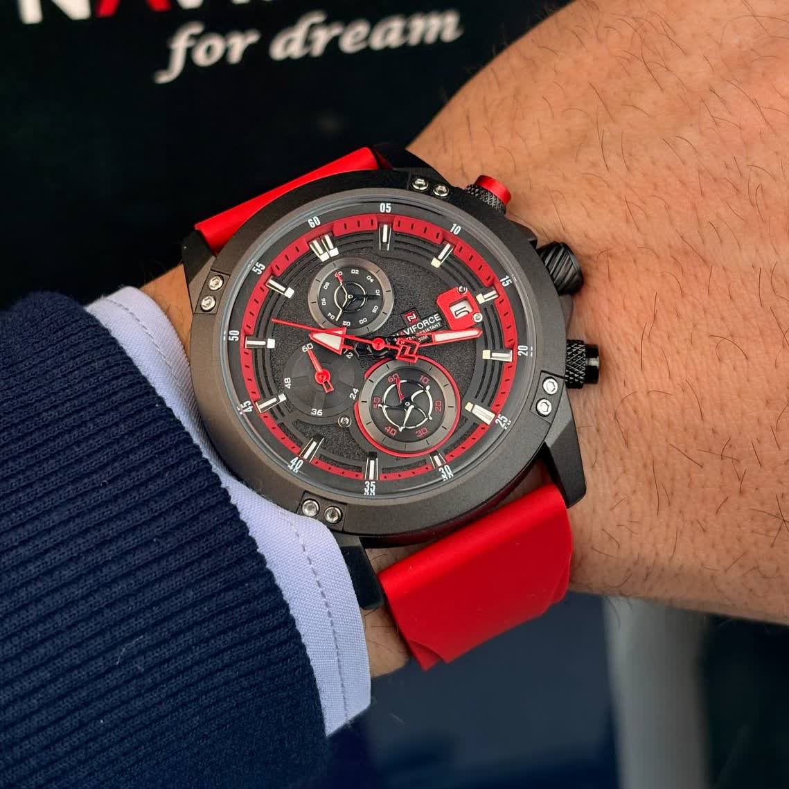 ساعت مچی مردانه نیوی فورس مدل Nf8033 با بند رابر قرمز و صفحه مشکی، یک انتخاب کمیاب و خاص پسند است. این مدل ارجینال با کارت گارانتی و جعبه به همراه گارانتی نیوی فورس ایران عرضه میشود. دارای کرنوگراف سه موتوره، تقویم، موتور ژاپن، ضد آب، قاب استیل، عقربه شبنما، بند رابر سیلیکونی ضد حساسیت پوستی، شیشه معدنی ضد خش و قفل کمربندی است. برای مشاهده و خرید این ساعت شیک به فروشگاه اینترنتی روبیمد سر بزنید.